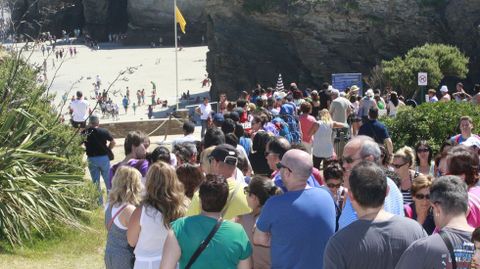 La gran mayoría de los visitantes se personaron con entrada: en papel o en el móvil. Habitual este verano es que el mogollón llegue dos o tres horas antes de la bajamar (14.50, ayer), cuando se registraron, en varios momentos, colas de visitantes. A pesar del abarrote, sobre la una solo unas quince personas se habían quedado a las puertas del monumento natural por no tener pase, según aclaró Iago García, uno de los trabajadores que recibía a los turistas. Reconoce que fueron casos concretos y que los afectados entendieron la situación. Pero ni él ni sus compañeros dejan al visitante sin alternativas. Les informan de que también tienen derecho a entrada quienes se alojen en establecimientos hosteleros ribadenses y quienes usen la línea de bus entre Ribadeo y la playa. Muchos tomaron nota y, ayer, la empresa de autocares, Eocar, superó la media de usuarios diarios, fijada entre 80 y 100.