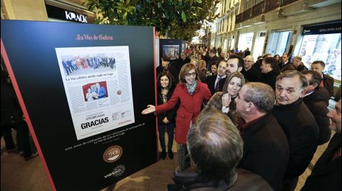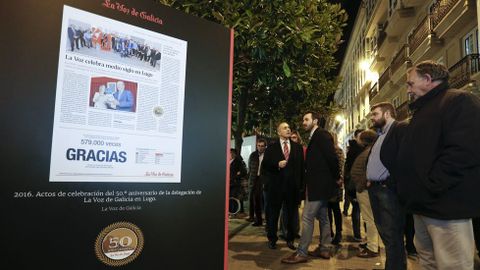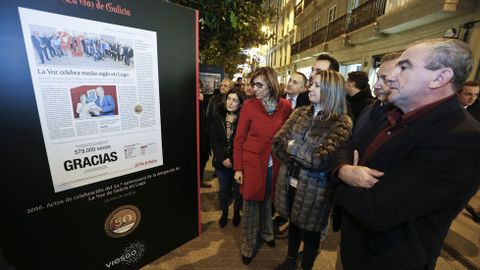 23 dic 2016 . Actualizado a las 13:42 h.La Voz de Galicia está de cumpleaños en Lugo. Hace medio siglo que se puso en marcha la edición provincial, siguiendo un sistema único en el periodismo nacional que acabó convirtiéndose en un gran éxito. Una de las conmenoraciones de esos cincuenta años es una exposición en la Rúa da Raíña 50 imágenes que ya son historia de Lugo y su provincia. A la inauguración acudieron cargos públicos, políticos (varios ediles del Concello), empresarios y personajes de la vida cultural, como Luis García Santalla (responsable de Viesgo en Galicia), Lara Méndez (alcaldesa), Darío Campos (presidente de la Diputación), Ramón Carballo (subdelegado del Gobierno), José Antonio Varela Agrelo (presidente de la Audiencia), José Manuel Rozas (jefe territorial de Vicepresidencia de la Xunta), Álvaro Santos (vicepresidente de la Diputación), Walter Álvarez (director territorial de Abanca Lugo), David Fernández (presidente de Lugo Monumental), José Reigosa (presidente de Aspnais), Ramón Ares (gerente del HULA), César Carnero (responsable de Patrimonio del Obispado), Adolfo de Abel Vilela (historiador) o Pablo Núñez (escritor), además de colaboradores de La Voz de Galicia.