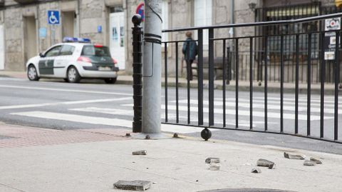 Al observar que habían caído cascotes de la cornisa, un vecino avisó a la Guardia Civil, que se desplazó al lugar y colocó cinta aislante para evitar el paso de peatones por la zona afectada.