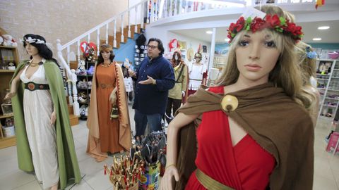 Unha de romanos leva unha década vestindo a nenos e maiores na súa particular viaxe a Lucus Augusti. Nos percheiros da tenda colgan atavíos de romanos e castrexos estudados ao milímetro. Fieis á historia. Explica Ángeles que as cores das cenefas de cada toga van en consonancia coa profesión, así, as verdes corresponden a médicos, os senadores visten de granate, e as azuis son para os cabaleiros. «Non son disfraces», subliña. Son vestimentas confeccionadas como na época. No taller da firma lucense non só se fabrican prendas, senón que tamén se fai un traballo didáctico. Axúdase a comprender a historia a través da indumentaria e dos complementos.