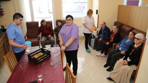 La residencia dispone de diez plazas y cuenta con cuatro habitaciones compartidas y dos individuales. Actualmente seis están ocupadas. También tiene un comedor y sala donde los huéspedes llevan a cabo sus comidas y sus diferentes tareas. «Cociño para todos igual e unha vez que comen pasan a tarde como lles apetece. Uns dan o seu paseo diario, outros quedan xogando a partida ás cartas, algún fai manualidades, outro axúdame a pintar caixas...», indica Isabel Niño, la madre de toda esta familia.