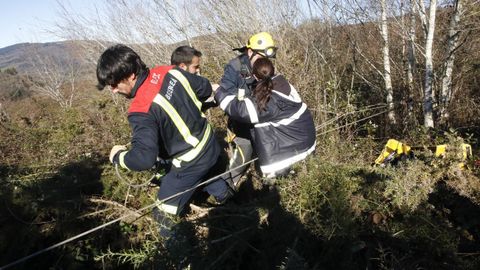 Tras poner en conocimiento de la Benemérita lo sucedido, agentes de la Guardia Civil, profesionales del Ges de Becerreá y del parque de Bomberos de Sarria, acudieron al lugar y trabajaron en la complicada zona para rescatar a los animales con vida. «Avisáronnos sobre ás 12.30 horas e cando chegamos xa estaban os compañeiros do GES. Baixou un rescatador por unha corda, amarrou un can cun pañal de rescate e subiuno. E así dúas maniobras, porque eran dous os cans que estaban na ladeira», explica Jose, cabo del parque de Bomberos de Sarria.