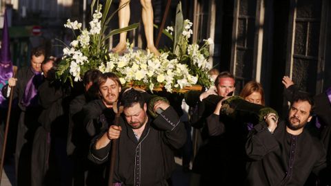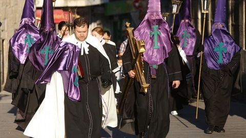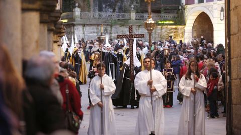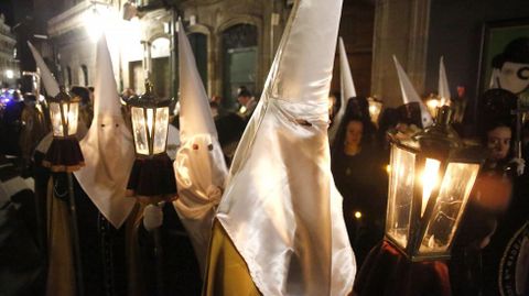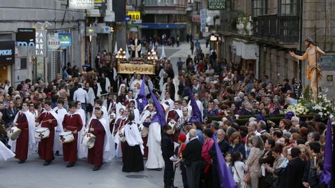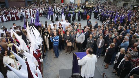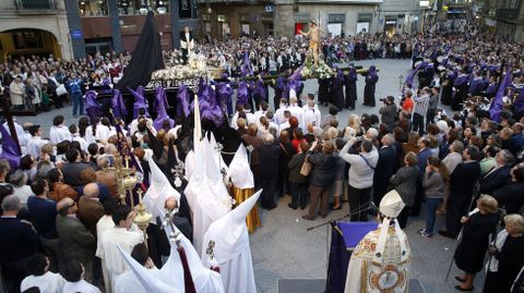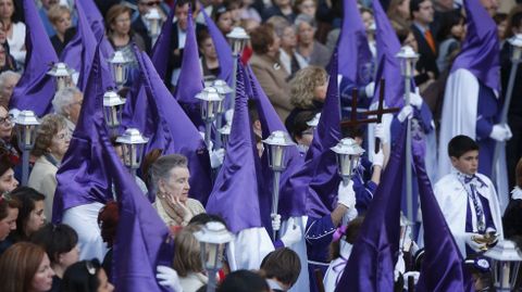 06 abr 2015 . Actualizado a las 12:07 h.Mucha expectación ayer en Pontevedra en el encuentro de los tres pasos en la plaza de A Peregrina. Después de que en los últimos días las siete cofradías de la ciudad, con unos mil penitentes, participasen en siete desfiles, el octavo, el de ayer, puso fin a la Semana Santa Pontevedresa. La imagen de Nuestra Señora del Amor Hermoso, acompañada de su cofradía, salió de la iglesia de San José por la plaza de la Constitución, Andrés Muruais y Peregrina. Antes, la imagen de Jesús Resucitado había salido de San Bartolomé, acompañada de la cofradía de la Veracruz, y tras pasar por Sarmiento, Pasantería y Antonio Odriozola, se encontró con la imagen de San Juan, que acompañada de la Cofradía del Mayor Dolor, había salido de Santa María. El encuentro fue seguido por numeroso público, que pudo contemplar los pasos aprovechando la excelente tiempo que brindó la tarde, a diferencia de años anteriores, cuando la lluvia deslució la celebración religiosa.