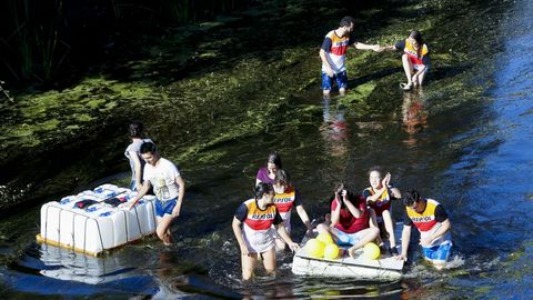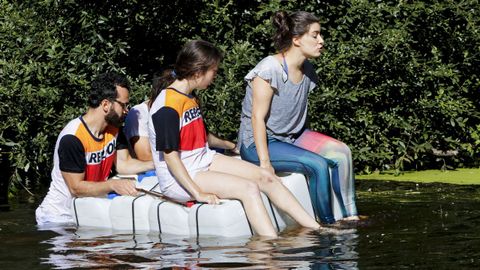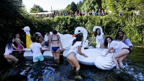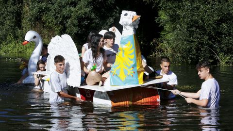 Algodón, chapas, madera, barriles, tablas y pinturas fueron los elementos con los que un equipo de 16 jóvenes construyeron un gran cisne para deslizarse por las aguas del Miño. Su embarcación, llamada Cisneiland, consiguió el segundo premio.