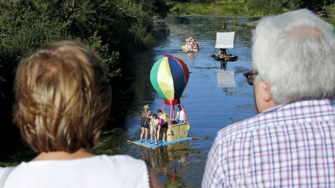14 ago 2018 . Actualizado a las 22:08 h.Las fiestas patronales de Rábade celebraron ayer el día del río con un descenso por el Miño en embarcaciones caseras. Un total de ocho barcas, cinco de adultos y tres de niños, compitieron por ser el barco más creativo y original, aunque el objetivo principal era «pasarlo bien y divertirse», cuenta la familia Sangiao, ganadora del primer premio en la categoría de adultos. Su embarcación Viaje en globo por el río Miño llamó la atención de los asistentes y del jurado. «Estuvimos un mes trabajando sin parar», explica la familia. Minutos antes de comenzar el desembarco, se mostraban ilusionados y convencidos de que «acabaremos en el agua, pero para eso venimos».