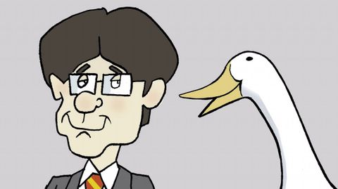 Todo en Puigdemont é, en apariencia, transcendente, heroico, ideal; pero non é así e de demostralo encargáronse os caricaturistas con imaxes desmitificadoras. A caricatura -Henri Bergson cualificouna de «arte diabólica»- descobre os segredos da cara do modelo e, como a cara é reflexo da alma, tamén os segredos da alma. A clave da caricatura está en apreixar a expresión do modelo, que está nos ollos e na boca. Nas caricaturas de Puigdemont os ollos teñen sempre as pálpebras semicaídas e a boca non deixa de surrir. Puigdemont surrí sempre, cun surrir contido; sen despegar os beizos, sen mostrar os dentes. É unha boca como a dos patos debuxados por Walt Disney, pero, en conxunto -a ollada lánguida e os beizos fruncidos-, a expresión de Puigdemont, fixa como a dunha carauta, non é de pato, senón de oca.