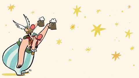 Es curioso el caso de Uderzo. No podía estar peor dotado, en lo físico, para ser ilustrador: daltónico y corto de vista, tenía dos dedos de más que hubo que extirparle por medio de cirugía, porque de niño se los mordía constantemente -no es broma, está en su biografía-. Y sin embargo tenía todo lo demás: el talento, el equilibrio en la composición, la capacidad para simplificar formas y sugerir movimiento. Luego, su unión con Goscinny dio lugar a una de esas parejas providenciales que aparecen a veces en la historia de la cultura popular: Laurel y Hardy, Gilbert y Sullivan, Tip y Coll... Como en todos esos casos, fue el encuentro de opuestos complementarios: el taciturno Uderzo y el cosmopolita Goscinny, que había pasado su juventud en Nueva York y su infancia en Argentina -por eso Obélix lleva en el pantalón los colores del Racing Club de Avellaneda-. Uderzo aportaba la limpieza de la línea clara, la ingenuidad de los rostros. Goscinny, el sarcasmo amable del hombre de mundo. Luego, cuando murió, Uderzo lo convirtió en personaje en La Odisea de Astérix: es el judío -Goscinny lo era- que guía a los galos desde Jerusalén al mar Muerto.