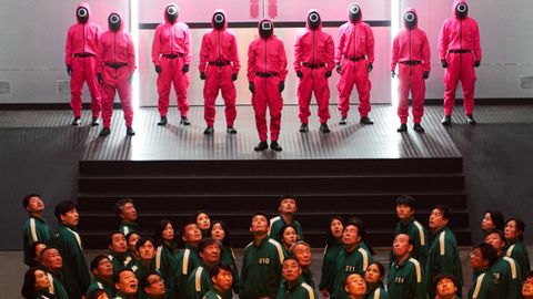En El juego del calamar los malos van vestidos con el disfraz que venden en los chinos, un atuendo andrógino y enmascarado al estilo de otras serie de éxito como La casa de papel. Parece como si los malos de hoy tuvieran que ir ocultos tras una máscara inexpresiva y dirigidos por una muñeca siniestra como la Coppélia del ballet de Delibes (los muñecos siempre tienen ese toque siniestro del autómata animado). En El juego del calamar un grupo de personas con problemas económicos tienen la oportunidad de salir de la miseria participando en un juego infantil dónde al que pierde lo asesinan.