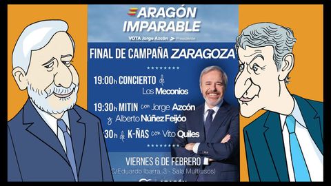 Agora teño ante min o cartel de peche de campaña do PP en Aragón e, canto máis o miro, máis digno me parece de figurar na máis rigorosa escolma do disparate político. Ver o candidato Jorge Azcón e o líder do PP, Núñez Feijoo, co niñato fachiña Vito Quiles, provocador de roxos e rebenta-roldas-de prensa no Congreso, e co dúo fachorro Los Meconios, intérpretes de cancións nas que expresan o desexo de volver ao 1936, se declaran machistas, racistas e fan mofa das «violacións en manada» —«Las feministas protestan por una violación grupal. Hay diez más que investigar, me da igual, son de Senegal»—, faime pensar que a barbaridades como esta aludía Julio Cortázar cando falaba «do lado comicamente grave da realidade». É todo tan irracional, tan choqueiro, tan sucio, que os comentaristas políticos o explicaron como un intento desesperado do PP para frear o ascenso imparable de Vox.