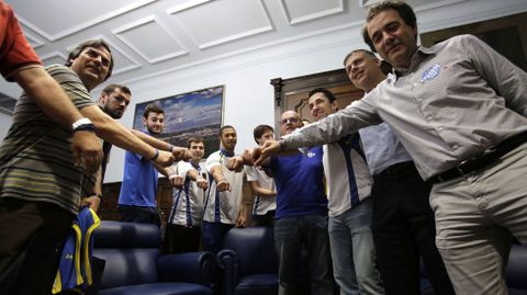 03 jun 2015 . Actualizado a las 21:42 h.Después de la celebración en plena pista del Club Ourense Baloncesto, que se dio un baño de multitudes ante 6.000 aficionados en el Pazo Paco Paz, ayer le tocó a jugadores, técnicos y directivos iniciar una gira de reconocimientos que se inició en la Diputación Provincial, donde fueron recibidos por su máximo responsable, José Manuel Baltar, así como por su ascensor de Deportes, Bernardino González.