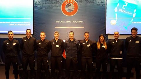 29 ene 2019 . Actualizado a las 20:52 h.La colegiada ourensana Zulema González estrenó recientemente su internacionalidad y sigue avanzando en una carrera meteórica, formándose junto a los mejores árbitros de la UEFA, en el curso que organizó el organismo europeo en Lisboa. En la imagen, González González posa con Velasco Carballo -responsable del colectivo nacional- y con el resto de internacionales españoles que acudieron.