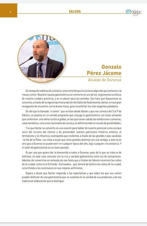Sin embargo, en la revista editada por Expourense coincidiendo con Xantar, el alcalde se manifiesta en otro sentido: «Expourense se convierte en ese gran escaparate de encuentro con la buena mesa, para reconfortar los más exigentes paladares». Y añade: «Y es que Xantar se convierte en una ocasión para hablar de nuestro potencial como enclave único del turismo del interior y de proximidad».