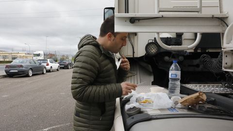 En un área de descanso del área industrial está Lorenzo Novoa, camionero que trabaja como autónomo. Apura un menú del día. «Hai moita xente que opta polo bocadillo, pero eu prefiro comer algo quente. Esta situación provoca unha gran incerteza. Menos mal que vas arranxando cos táper», señala.