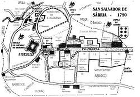 10 dic 2005 . Actualizado a las 06:00 h.En 1753 a parroquia de San Salvador de Sarria tiña as estremas que conservou ata 1890: do marco dos Esqueiredos ao marco do Pombal Vello, de alí ó marco da Cruz, dalí ao marco da capela do Campiño, dalí á Ponte da Áspera para rematar no marco dos Esqueiredos. O mosteiro da Madalena, a ermida da Santiago do Mercado, a Fortaleza coa cerca e as súas catro torres, o Hospital de Santo Antón, a igrexa de San Salvador e a Casa Grande eran as edificacións máis significativas. San Salvador, Arriba, Sarria, O Forno e A Áspera eran os barretes desta parroquia, que formaba curato coas de Vilar de Sarria e San Martiño de Requeixo, e que reunía un total de 25 casas. En San Salvador eran propietarios: Francisco Loureiro dunha casa e dúas tarreas; Antonio Díaz, de Santiago de Freituxe (Casa Capón de Arriba). No sitio de Arriba: don Francisco de Armesto, unha casa e unha tarrea (Casa dos Armesto ou do Puro). No paraxe de Sarria tiñan edificacións: Fernando López, Unha casa (Casa Vilaesteva); Manuel Melle, unha casa xa desaparecida; Fernando Pérez, unha casa (solar da Casa Gallego); Xosé de Armesto e Somoza, unha casa e unha tarrea (solar da Casa Guerra); Bernardo Rivera de Fontao, unha casa (Casa Vaamonde ou Concello); Condesa de Lemos, unha casa (Cárcere); Lucas Somoza e Saavedra, unha casa e dúas tarreas (Casa Grande ou da Torre dos Saavedra e Casa de Rivas); Francisco Illanes, unha casa (Casa de Yebra e Miralde); Miguel de Rivas, unha casa (Casa Marzán); Martiño Díaz, unha casa xa desaparecida; Anxo Rodríguez de Farbán, unha casa (Casa Arangüena). No paraxe do Forno: Inés Fernández, unha casa; Cristovo Díaz, unha casa. Nesta zona, agora chamada Fornos de Atrás, por motivos de seguridade estaban os fornos da vila en evitación de incendios. Na aldea da Áspera: María López, unha casa e dúas tarreas; Roque Díaz, de Maside, unha casa tarrea. A única propiedade comunal desta parroquia estaba formada por 16 ferrados de monte perto da Fortaleza, onde se celebraba o mercado medieval, e que forma parte agora do campo da feira. Entramado O entramado urbano estaba formado polo treito de rúa entre a Casa Macía, entón a de Santa Mariña, e a igrexa de San Salvador, que era coñecida como a rúa principal. A actual Plaza da Constitución era a Plaza Pública. O camiño por entre a Fortaleza e a Casa Ferrreirós era o camiño de Albán. A baixada cara á ermida de San Lázaro, en Maside, era a Corga da Calexa (pola canle de rego que levaba a auga da fonte de San Salvador aos prados dos Barredos e do Campiño). Entre as Airas da Pedreira e os Esqueiredos ao Camiño Francés de Fora, na Idade Media camiño do Pombal que pola Veiga e Os Peares de San Miguel ía cara ao Mesón de Maside. Entre San Salvador e o Camiño Francés de Fóra, a súpeta Corga de Matavellas e desde A Madalena á ponte da Áspera e en dirección a San Lázaro e ao Camiño Real (desaparecido ao se abrir as canteiras da Áspera) e ao camiño de Celeiro e O Mazadoiro pola Corga do Convento.
