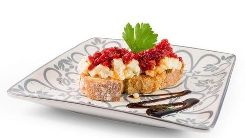 Alquimia. «Tosta do Alquimia». Lleva brandada de bacalao con confitura de pimiento y anchoa.