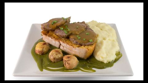 Alento Bakery. «Alentiña outonal». Base de pan de calabaza, con carrilleras y catañas, puré de patatas y crema de grelos.