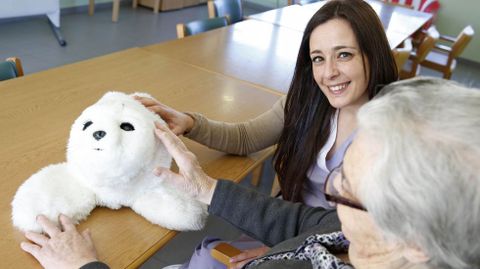 06 abr 2017 . Actualizado a las 14:16 h.Hace un año que Lorena Gándara tiene una compañera de trabajo en Geriatros muy especial. Se llama Nuca y es uno de los dos robots que, con forma de bebé de foca, el grupo residencial tiene en Galicia para realizar terapias sensitivas con los mayores. Además de la formación básica para poner en marcha y utilizar la máquina, esta joven profesional nacida en Ribadavia no para de investigar sobre los diferentes usos y cómo sacar un mejor partido a esta singular herramienta, aunque, según afirma, con quien más aprende es con los propios residentes día a día, analizando sus reacciones y sus progresos.