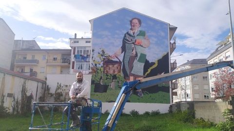 «Adaptamos a campaña cunha iniciativa que non requiría de contacto con ninguén pero que podía ser apreciada por calquera», dice Ana Pardo, gerente de Monteval. Y tanto que puede. Se trata de un enorme mural realizado en la fachada lateral de un edificio situado en la calle Irmáns Moreno de Verín. El artista encargado de pintarlo es el cambrés Joseba Muruzábal. La obra se enmarca dentro de su serie Fenómenas do rural con las que homenajea la vida y los oficios de las mujeres del rural, ensalzando su poder y su capacidad. «Dibujo partiendo del humor, del cariño y de una profunda admiración. Cojo la realidad social en este sentido y la coloreo con una ficción actual en la que me siento muy cómodo», dice Muruzábal. El de Verín tiene por protagonista a una viticultora, Isabel Alonso, la primera mujer registrada en la Denominación de Origen Monterrei. «É un tributo á muller rural pero na pel das propias viticultoras da nosa zona, que son un símbolo do empoderamento feminino para todas», afirma Ana Pardo. Isabel, que es natural de Oímbra, ahora forma parte de las superabóas retratadas por Muruzábal y se convierte en un emblema femenino en la capital de su comarca.