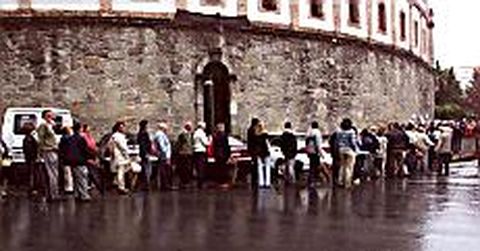 : COLAS EN LA PLAZA DE TOROS. Decía el domingo el barómetro de verano de este periódico que los protaurinos duplican en Pontevedra a los que odian la fiesta nacional. Pues no hay más que echar un vistazo a la imagen superior para darse cuenta. Los aficionados se apostaron ayer en masa -dicen que alguno incluso desde las seis de la madrugada- ante el coso de San Roque para conseguir entradas para la feria de la Peregrina, que se celebrará los días 4, 10 y 11 de agosto. : LAS TAQUILLAS abrieron a las diez de la mañana, cuando la enorme cola de aficionados ya daba la media vuelta a la plaza. A partir de ahí, todo un ejercicio de paciencia. Y es que hacer cola da hasta para hacer amigos. Hablas del tiempo -en medio del chaparrón-, de lo despabilados que son algunos que se van colando hacia la fila de forma disimulada, de lo lento que va el proceso... y de vez en cuando a lo lejos se oye un tremendo abucheo, seguramente la bronca a algún listillo que intentó una maniobra de acercamiento sin éxito. Finalmente, quien más y quien menos encuentra lo que busca. Así que, como se dice, la plaza estará abarrotá . : LA FERIA. Hay que recordar que la primera de feria será el domingo 4 de agosto, con un cartel de sobra conocido: Enrique Ponce , El Juli y Manuel Caballero . La segunda corrida, el día 10, reunirá en el coso a Luis Francisco Esplá , Luis Miguel Encabo y Eugenio de Mora y, por último, el día 11 le tocará el turno a Juan José Padilla , Antonio Ferrera y David Fandila El Fandi . : FESTICLOWN. Viendo esta expectación, es de esperar que, un año más, la feria de la Peregrina sea el acicate de las fiestas de agosto. De lo que hay que hacer balance ahora es del Festiclown, que finalizó el pasado domingo con un homenaje al maestro del clown Carlo Colombaioni . Precisamente, el italiano acompañó ayer a Iván Prado , director del festival, y al edil Luis Bará a la hora de valorar el certamen. Según aseguraron estos últimos, cerca de 4.500 personas siguieron los espectáculos del Principal y otras 5.000 las actuaciones de calle. Finalmente, se recaudaron 8.414 euros para la caravana de payasos que visitará Palestina. Bará incluso habló de «enraizamento e proxección nacional e internacional» del Festiclown y Prado de buscar espacios más grandes. ¡Sobra optimismo!