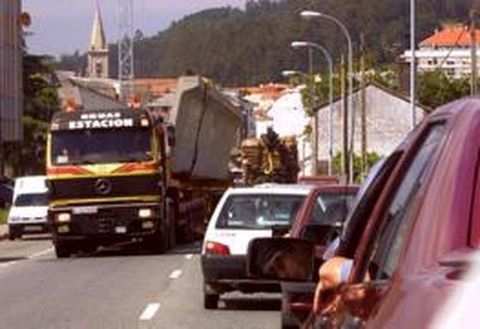 A El Ayuntamiento de Caldas dirá adiós a los atascos en su casco urbano aunque no antes del 2005? El Ministerio de Fomento licitó ayer, tras más de una década de espera, la variante de la N-550. La construcción de la ansiada circunvalación tiene un plazo de 25 meses y un presupuesto de 25 millones de euros. Más de 15.000 vehículos cruzan a diario la travesía urbana, a los que hay que sumar el paso de transportes con mercancías especiales -como el de la imagen-.| L8