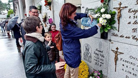 Los camposantos estaban relucientes, con los nichos y panteones impecablemente adornados con las miles de docenas de flores que se vendieron estos días en el mercado de A Ferrería, en almacenes y floristerías. Como es habitual, el cementerio de San Mauro, por ser el de mayor capacidad, fue uno de los más concurridos y reforzó sus servicios. Seis operarios de guardia, repartidos en dos turnos, se encargaron de atender todas las incidencias y necesidades que se producen en una jornada como esta, desde el vaciado continuo de los contenedores, hasta ayudar a abrir la cerradura oxidada de la vitrina o colocar la escalera a personas mayores con dificultades para acceder a los nichos más altos. Ayer no había tumba sin flores y, como siempre, llamaron la atención los panteones de las familias de etnia gitana por la profusión de adornos e imágenes y la permanencia ante ellos de los allegados de los difuntos durante todo el día.