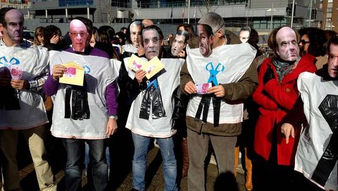 07 feb 2013 . Actualizado a las 20:59 h.Los empleados públicos de la Xunta se concentran en la hora del café contra los recortes del Ejecutivo central. Lo hacen, como cada jueves, pero en esdta ocasión aprovechan el tirón del Entroido para hacer más llamativa su protesta. Disfrazados de Bárcenas, Dolores de Cospedal o Mariano Rajoy quisieron parodiar la situación que atraviesa el país. Muy al hilo de la actualidad, los funcionarios ya se manifestaron la pasada semana con sobres llenos de dinero. Esta rutina arrancó a finales del 2012 y aunque en un primer momento sería solo hasta que se aprobasen los Presupuestos de la Xunta, los afecartdos por los recortes decidieron continuar en el 2013.