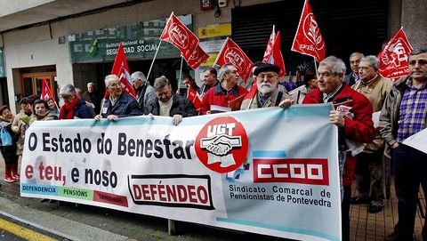 12 feb 2014 . Actualizado a las 07:00 h.Un grupo de pensionistas y jubilados de Comisiones Obreras y de UGT se concentraron ayer ante la oficina del Instituto Nacional de la Seguridad Social de Pontevedra para exigir al Gobierno la retirada del nuevo decreto que regula la revalorización de las pensiones, con la consiguiente pérdida de poder adquisitivo. foto capotillo