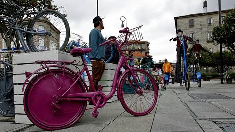 La praza de A Ferrería fue ayer el escenario de la presentación de Pontenbici, el programa anual diseñado por el Concello para fomentar el uso de la bicicleta como medio de transporte y como práctica deportiva. Una escultura multicolor creada con las máquinas tuneadas del antiguo Pillabici y dos grandes velocípedos manejados por artistas de animación conformaron un decorado especial para sorpresa de los viandantes. Las actividades son múltiples y variadas. Arrancarán el próximo fin de semana y se prolongará hasta el mes de junio. Século XX en bicicleta es el título de la exposición que se inaugurará este viernes en el Pazo da Cultura, donde se podrán ver cerca de cien máquinas clásicas y antiguas, entre ellas una Guillot de 1915. La apertura de esta muestra irá acompañada de una conferencia de Juan Granados, presidente de la Asociación Nacional de Bicicletas Antiguas y Clásicas, que hablará sobre la historia del ciclismo en Pontevedra. Y el domingo 27 se celebrará la gran Pedalada familiar, todo un clásico de la primavera pontevedresa. Saldrá de la praza de España a las 11 horas y se esperan superar los 2000 ciclistas de la edición anterior.