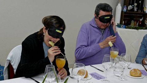 En este almuerzo accesible se sirvió un menú normal. La diferencia estaba en que tenía que ir todo deshuesado y a la hora de emplatar había que seguir el sentido de las agujas del reloj. El ingrediente principal, carne o pescado, bien centrado en el plato. Si llevaba salsa, había que situarla a las 3, y la guarnición, a las 12. Y para servirlo en la mesa, también mucha centralidad. Buñuelos de bacalao, empanadillas de atún, ensalada de lubrigante con vinagreta de frutos secos, rape al horno con salsa marinera, muslo de pollo trufado y, de postre, un combinado de frutas con chocolate. En eso consistió el menú, que estaba «para chuparse los dedos». A los comensales sin ceguera que vivieron la experiencia con antifaz, los sabores le parecieron más intensos con los ojos cerrados.