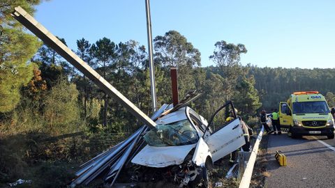 Los Bombeiros do Salnés fueron los primeros en llegar al lugar del siniestro. En cuanto vieron el vehículo, del interior del cual salían varias vigas del cartel, se temieron lo peor. Pero se encontraron al conductor, que había salido por su propio pie del interior del mismo, tumbado en el suelo, porque estaba mareado.