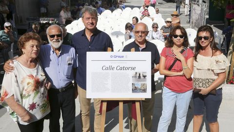Ese nombre, A Catorse, es un símbolo de la importancia que la emigración tuvo para O Grove. Para su economía, sí, pero también para su cultura. Hasta para el idioma, porque desde hace años el ghalegho do Ghrove del que tanto presumen los mecos está trufado de versiones más o menos libres de términos en inglés. Así se recordó en el acto de ayer, en el que la calle tuvo protagonismo: se descubrió una placa con la historia de su «chata»; acabará colgando en algún rincón de la vía. Pero hubo otras cuatro voces que resonaron ayer a mediodía para ayudar a los muchos grovenses presentes a hacer memoria de la emigración. De la de antes y de la de ahora.