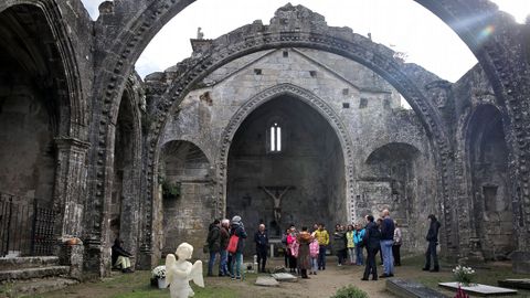 Este cementerio cambadés es muy particular. Para quienes lo conocen, esa afirmación adquiere rango de obviedad: ha sido declarado monumento histórico artístico y forma parte de la red de cementerios singulares. Pero, al fin y al cabo, es un camposanto. Y por eso ayer, a las puertas de la celebración del día de recuerdo de los difuntos, en Santa Mariña había un trasiego especial de gente que atildaba los lugares de descanso de sus seres queridos. La mayoría no se inmutaba ante el paso de la comitiva encabezada por una mujer vestida de época. Y es que este rincón de Cambados es, también, un punto de referencia habitual para los turistas que eligen O Salnés. Para muestra, la nutrida excursión de franceses que a mediodía se adentraron en las ruinas, con los paraguas tan abiertos como los ojos, para disfrutar de tan fabuloso entorno bajo la lluvia helada e intermitente. Por que el brusco cambio de tiempo anunciado por los meteorólogos se cumplió a rajatabla. Chubascos y un frío intenso sirvieron de telón de fondo para esta ruta literaria y para las otras que, también planificadas por la Diputación, se desarrollaban a la misma hora en otros dos cementerios de la provincia.
