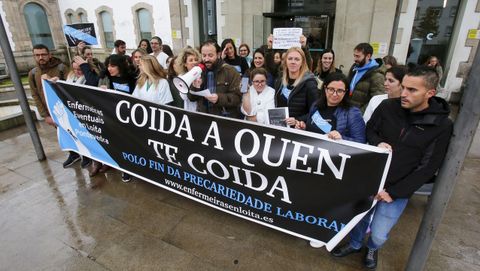 13 nov 2019 . Actualizado a las 05:00 h.Con gritos de «Todas somos Alba, coida a quen te coida», y «Campa, dimisión» -en alusión al gerente del Sergas- concluyó este martes la protesta mensual de cada día 12 del colectivo Enfermeiras Eventuais en Loita. En la entrada del Hospital Provincial de Pontevedra desplegaron una gran pancarta y leyeron un manifiesto. El enfermero Edu García fue el encargado de darle voz y desvelar quién era la Alba de las consignas, con quien también se solidarizó la Asociación de Celadores Galegos.