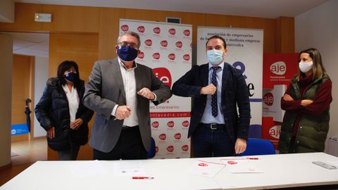 Los presidentes Asociación de Jóvenes Empresarios (AJE), Jesús Rey, y de la Asociación de Pequeñas y Medianas Empresas de Pontevedra (Aempe), José María Corujo, suscribieron ayer u convenio de colaboración para poner en marcha conjuntamente «actividades que impulsen la gestión, fomento y defensa de los intereses empresariales, económicos, sociales, formativos y culturales de los diferentes sectores empresariales». El acto de firma (en la imagen), se levó a cabo en la sede de la AJE.