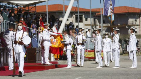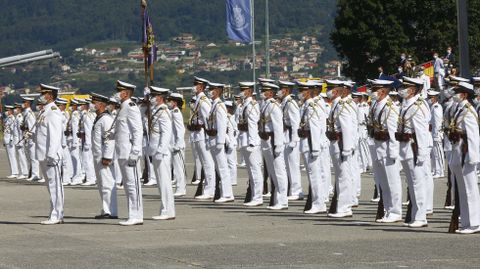 En el acto celebrado ayer se llevó a cabo un emotivo homenaje a los caídos, con honras militares. Asimismo, se produjo la jura de bandera de 79 aspirantes, entre ellos 13 mujeres, que ahora tienen por delante cinco años de formación tanto militar como castrense, porque hay que recordar que en la Escuela Naval también se imparte una titulación civil, bajo la supervisión de profesores universitarios dependientes de la UVigo.