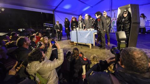 Pero antes de oficializar el inicio de las fiestas quedaba otro de los trámites inherentes a esta cita: la lectura del pregón. En esta ocasión los encargados de llevarla a cabo fueron los integrantes del grupo Os das Pistas, quienes aprovecharon que la efeméride caía en viernes 13 para hacer todo un homenaje al género del terror al transformarse en muertos vivientes, esto es, zombis.
