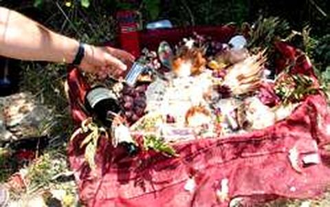 En una cestilla había patas de gallina, uvas, colonia, maquillaje y hasta champán francés Alrededor de la cesta se habían quemado tres velas rojas y se veían colillas, miel y cerveza