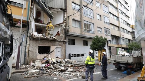 Por otra parte, máquinas y obreros comenzaron este miércoles por la mañana el derribo de la casa seriamente dañada por la deflagración de la bombona de butano en esta céntrica calle. Se trata de una intervención de urgencia, por parte del Concello, ante el riesgo de que el edificio colapsase y cayese sobre la calle causando múltiples problemas.