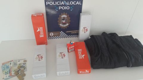 Los agentes de Policia Local de Poio investigan al hombre por presuntos delitos contra la propiedad industrial y presunta falsedad de efectos timbrados. Tambien se abre la vía administrativa tramitando denuncias por la Ley de Impuestos Especiales, por la posesión y venta de tabaco ilegal.