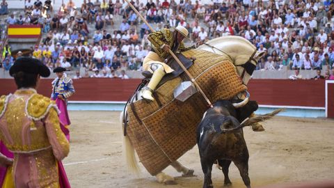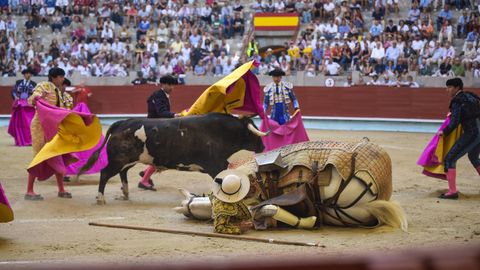 Mucha peor suerte acompañó a José María Manzanares. Chalinito, de 525 kilos de peso, empitonó y derribó a uno de los caballos de los picadores, que quedó tirado en el suelo durante unos minutos y que se resistió a soltar su presa. Cuando se fue detrás se apartó, el caballo, maltrecho, pudo retirarse.