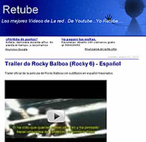 03 ene 2007 . Actualizado a las 06:00 h.Desde hace varias semanas los internautas recomiendan aquellas bitácoras o webs gallegas que destaquen por su contenido, por su diseño o por su originalidad. Una de las últimas recibidas es www.retube.blogspot.com, una página administrada por un coruñés. Incluida dentro del fenómeno Web 2.0, la web no es una nuevo portal de vídeos en línea, sino una página en donde se recopilan las mejores grabaciones recogidas en sitios como Youtube, Google vídeos, Live vídeos, etc. Las temáticas son, además, de lo más variado, desde el ya polémico y famosos vídeo de Sadam Huseín, hasta otro en que se ve a una chica de dos cabezas, pasando por anuncios de Paris Hilton o de Monica Belluci.