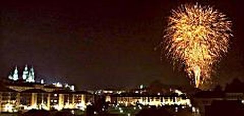 Un espectáculo pirotécnico más vistoso que el de la noche del 24 cierra las fiestas mayores de Santiago La Alameda fue anoche el Obradoiro. Desde la escalinata del Campus Sur, unas 20.000 personas, según fuentes de la organización, vieron el espectáculo pirotécnico que comenzó a cerrar las Festas do Apóstolo 2001. Durante dieciséis minutos se quemaron seiscientos kilos de pólvora. Se tiñó el cielo de colores. La vistosidad del evento sirvió para endulzar el gusto amargo que la noche del 24 había dejado a los compostelanos. Al final, muchos aplausos. Tantos como los que recibió La Oreja de Van Gogh. La banda de San Sebastián llenó la praza da Quintana para despedir con música las celebraciones más cortas de los últimos cinco años.