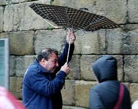 Reportaje | El temporal en Santiago El fuerte viento obligó a los bomberos y a la policía local a realizar numerosos servicios para retirar pancartas, carteles publicitarios, tejas, macetas y árboles rotos
