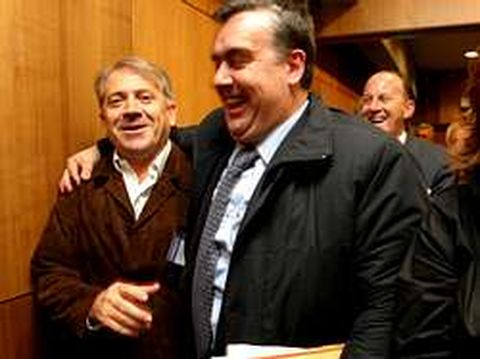 La imagen de archivo de Juan Juncal y Xosé Cuiña refleja uno los encuentros que ponían en evidencia la deportividad con la que había que tomarse la actividad en el seno del PP. La situacion está ahora enconada en la arena política de Compostela.