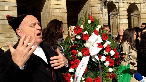 Con su traje de gaiteiro el payaso dejó una corona de flores delante de la puerta de la catedral compostelana recordando que «es más probable que los huesos que descansan dentro sean los de Prisciliano que los de Santiago», razonando que «una barca de piedra tiene pocas posibilidades de flotar».