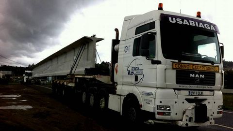 «Detrás de la espalda -dice Antonio, el transportista de la empresa Usabiaga- llevo 47,90 metros de viga. Todo el conjunto, incluida la cabeza tractora, son 61 metros». Cada una de las piezas pesa casi 98 toneladas y varias de estas gigantescas fichas de Lego llegan cada día a Compostela procedentes de Forjados Castelo, en Coirós. «Por carreteras nacionales y autovías podemos circular por el día, pero no por la autopista, donde solo nos dan permiso entre las doce de la noche y las seis de la mañana. Y para llegar en un tiempo razonable a Goián no queda más remedio que utilizar la autopista», explica el camionero. Lo del tiempo razonable es un decir. Es razonable en esta escala de cosas mayúsculas: cuatro horas de conducción, siete si se incluyen las correspondientes paradas y el cambio de escolta de la Guardia Civil, para ir de la capital de Galicia al sur. Al llegar a Baiona y salir de la AP-9, Antonio tiene que esperar a que sea de día para circular de nuevo por la autovía, que solo admite tráfico diurno de este tipo. «Tengo permiso -dice- para circular, como mucho, a sesenta por hora. Pero es imposible aburrirte aunque vayas a esa velocidad, tienes que estar pendiente de demasiadas cosas», afirma.