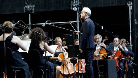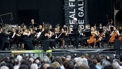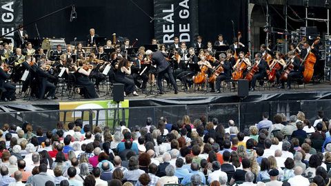 Pocas veces se tiene la oportunidad de escuchar a la Real Filharmonía de Galicia fuera de los grandes auditorios, por lo que sus conciertos a pie de calle generan una gran expectación. La orquesta dirigida por el británico Paul Daniel ofreció ayer en A Quintana uno de esos recitales a cielo descubierto, en el que no quedó ni una silla libre de las mil disponibles para verlo. A ellos se sumaron otros muchos asistentes en una plaza entregada a la música clásica.