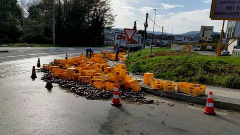 El accidente, que dejó un intenso olor a cerveza en la zona, obligó a cortar un carril de la N-550 durante dos horas. Al lugar se desplazaron efectivos de Protección Civil y de Demarcación de Carreteras, que estuvieron trabajando en la zona hasta las 14.00 horas.