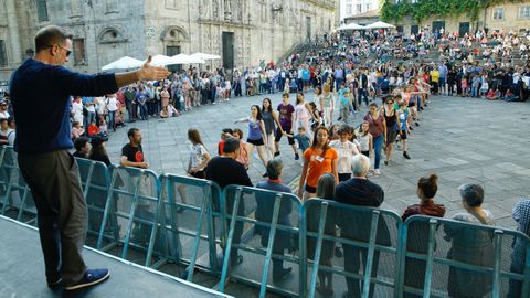 A participar en el taller previo a su actuación de la Dominic Graham School se animaron mayores y pequeños, hombres y mujeres, compostelanos y turistas. Una enorme rueda giraba en medio de la plaza, bajo la atenta mirada de los demasiado tímidos para unirse al baile. Tras los primeros ensayos con el único acompañamiento de las indicaciones de Graham, llegó el momento de ir a por todas. Y Xoán se subió al escenario. Agarró su violín y empezó a tocar. Y cogidos de la mano, los nuevos bailarines comenzaron a girar. Sí. Lo había conseguido. Cuarenta minutos. Y estaban bailando una de las danzas más difíciles de aprender. Dominic Graham es un gran profesor.