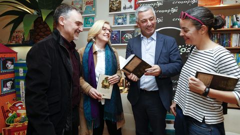 Ese es el título de la obra de Uxía Meirama que la autora presentó ayer en la céntrica librería Cronopios. Dirigida a niños de 10 a 12 años, la primera edición ha salido en gallego y cuenta con la aportación del ilustrador Miguelanxo Prado, quien también asistió a la presentación junto con Meirama y la editora Gemma Sesar. En la imagen, también el secretario xeral de Política Lingüística, Valentín García.